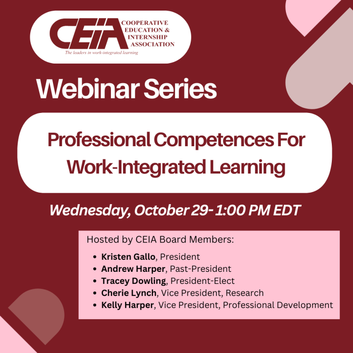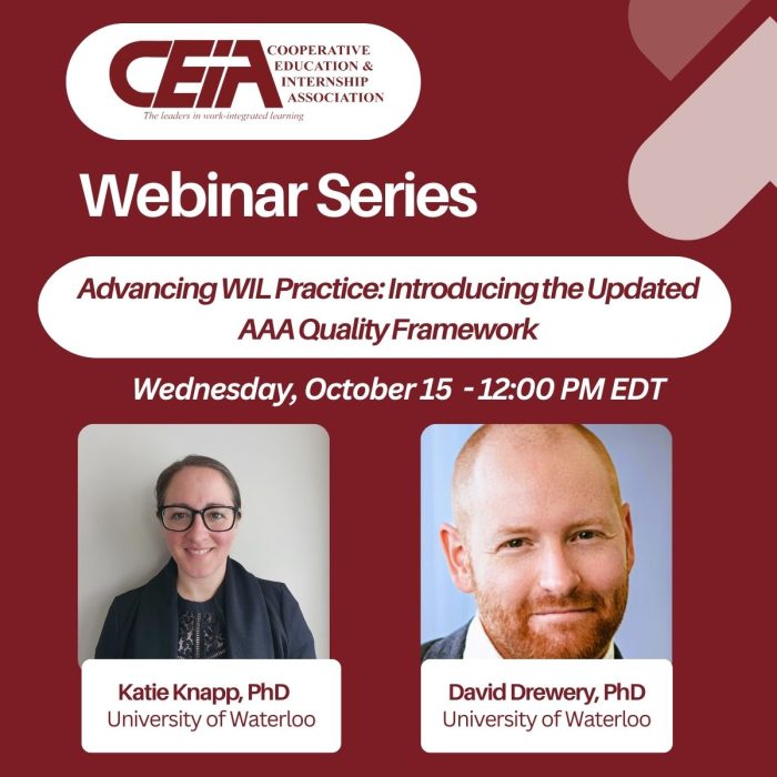 Explore CEIA’s Professional Competencies for Work-Integrated Learning (WIL) Practitioners in this engaging session. Learn the essential skills and knowledge needed to excel in WIL roles while supporting both student and employer success. Join CEIA leaders Kristen Gallo, Andrew Harper, Tracey Dowling, Cherie Lynch, and Kelly Harper as they provide insights and guidance to help you strengthen your practice and connect with peers shaping the future of the field.