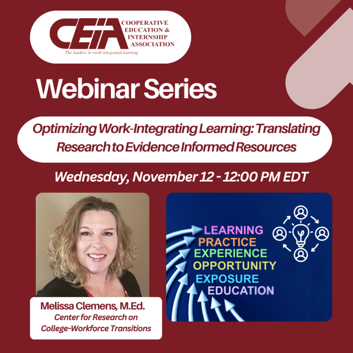 Work-integrated learning (WIL) is widely recognized as a high-impact educational practice, yet its quality and accessibility can vary significantly across institutions and programs. In this session, Melissa Clemens will lead participants on an exploration of key research findings from the Center for Research on College-Workforce Transitions (CCWT) that shaped the development of innovative tools designed to enhance WIL experiences. Participants will see a live demonstration of practical resources aimed at improving program design, increasing student engagement, and expanding access to meaningful work-based learning opportunities.